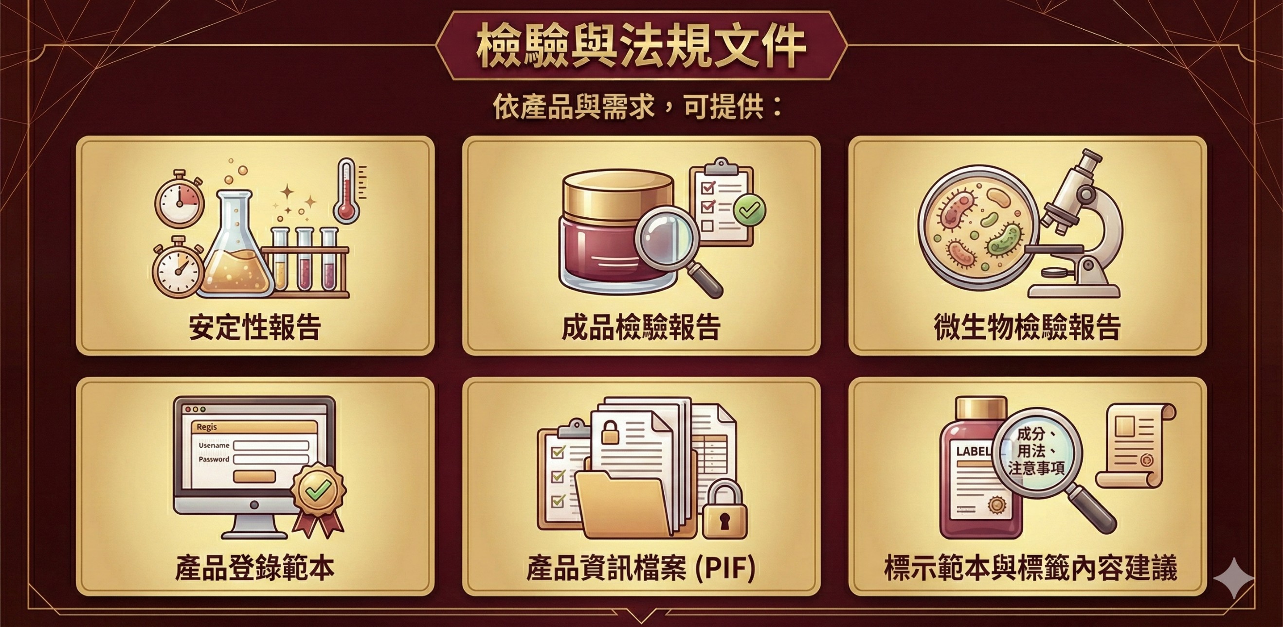 法規支援: 協助化粧品登錄、PIF、檢驗報告與標示範本。